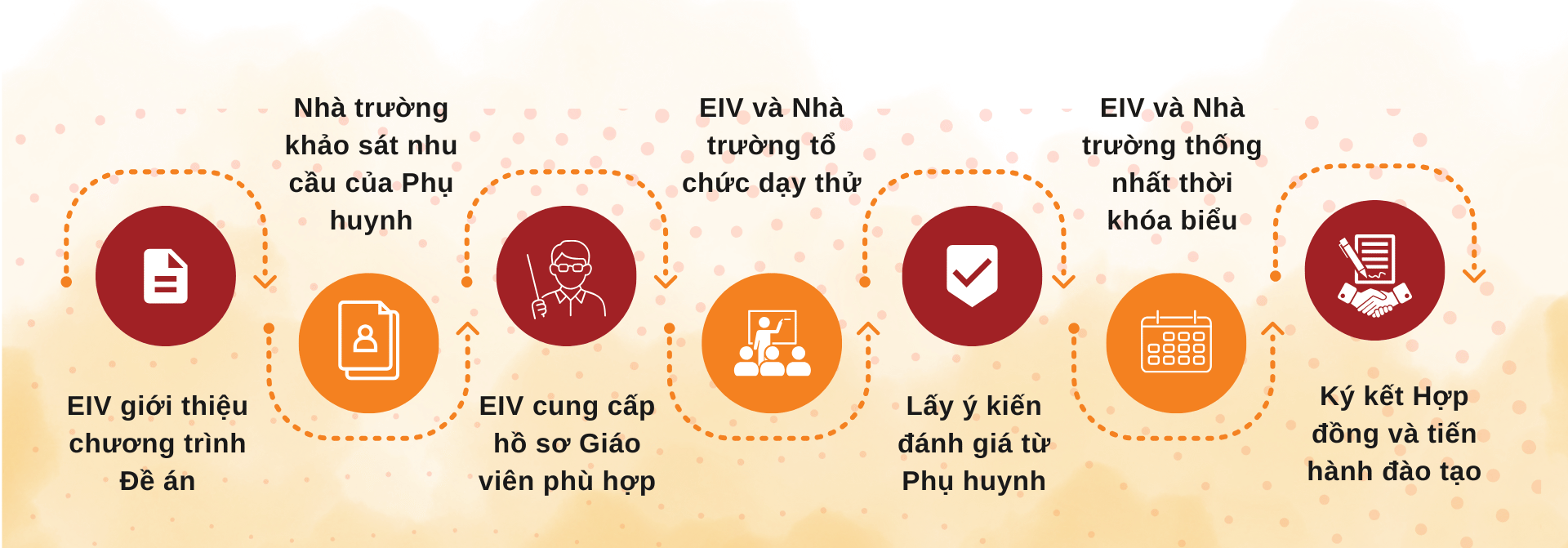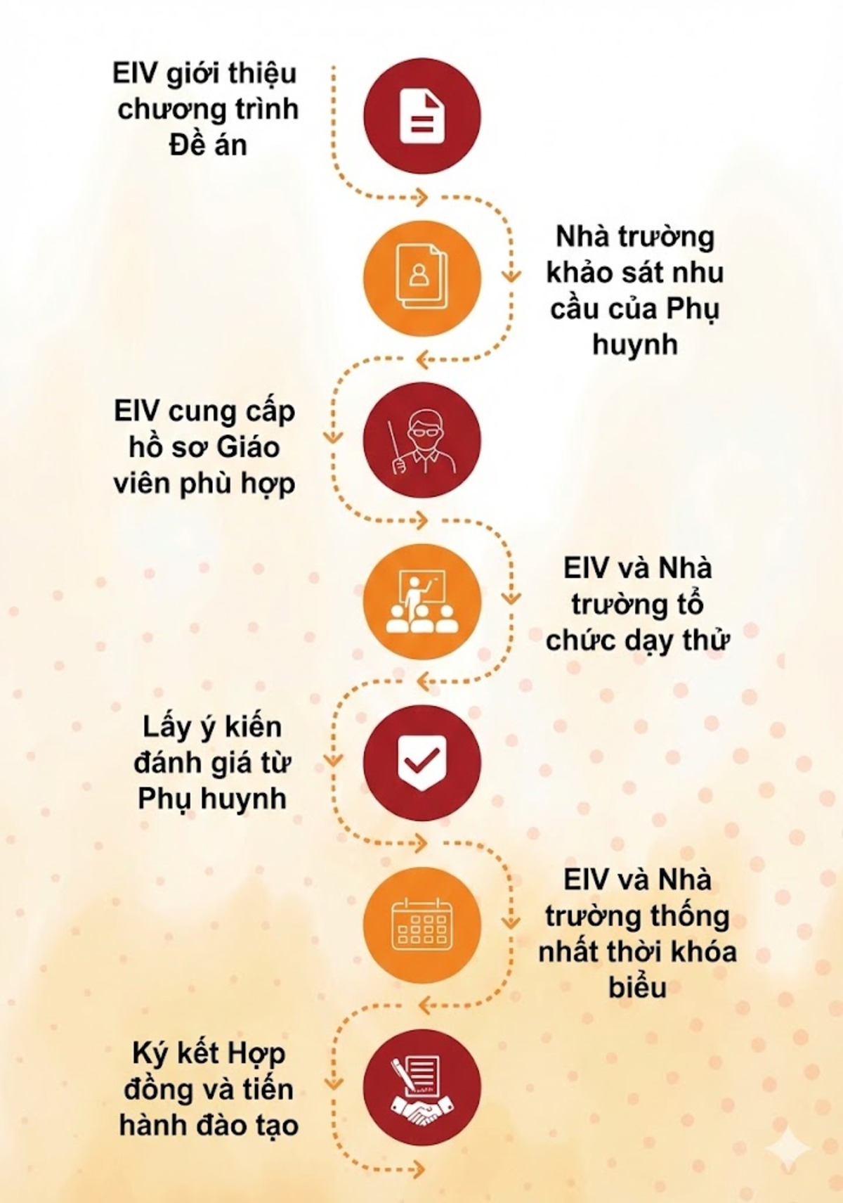 Quý trường/trung tâm liên hệ EIV qua hotline: +84 28 7309 9959 , cung cấp thông tin nhu cầu, EIV sẽ hỗ trợ toàn bộ quy trình: khảo sát, xây dựng chương trình, cung ứng giáo viên bản ngữ, triển khai, giám sát và báo cáo định kỳ.