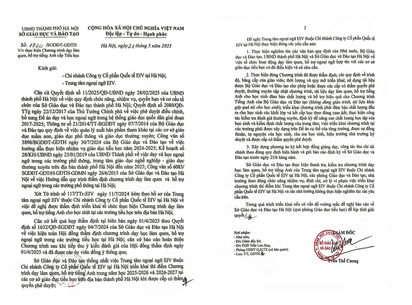 Chương trình Tiếng Anh liên kết cho học sinh tiểu học tại EIV là chương trình được Sở Giáo dục và Đào tạo Hà Nội cấp phép chính thức ngày 21/5/2025, triển khai tại các trường tiểu học trên địa bàn thành phố với 100% giáo viên bản ngữ có kinh nghiệm trên 2 năm và đầy đủ bằng cấp quốc tế (TESOL/CELTA/TEFL). Nội dung chương trình được nghiên cứu và thiết kế chuyên biệt, bám sát phạm vi Tiếng Anh cần đạt cho Học sinh Tiểu học theo thông tư 32/2018/TT-BGDĐT và khung kỳ thi Cambridge YLE (Starters, Movers, Flyers)