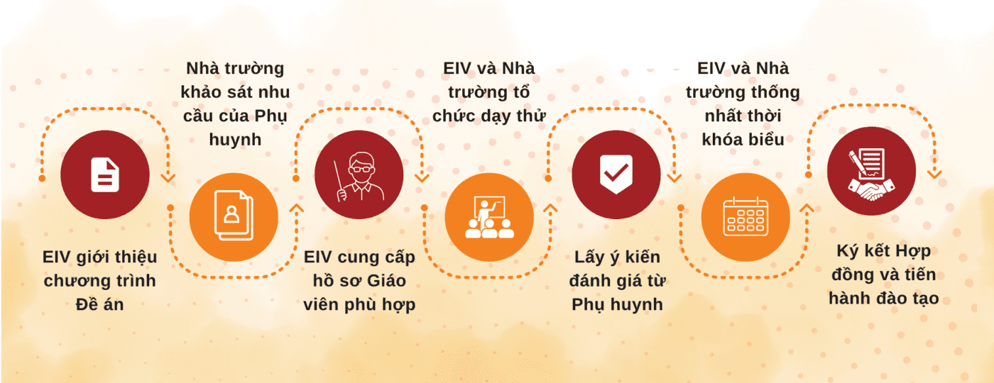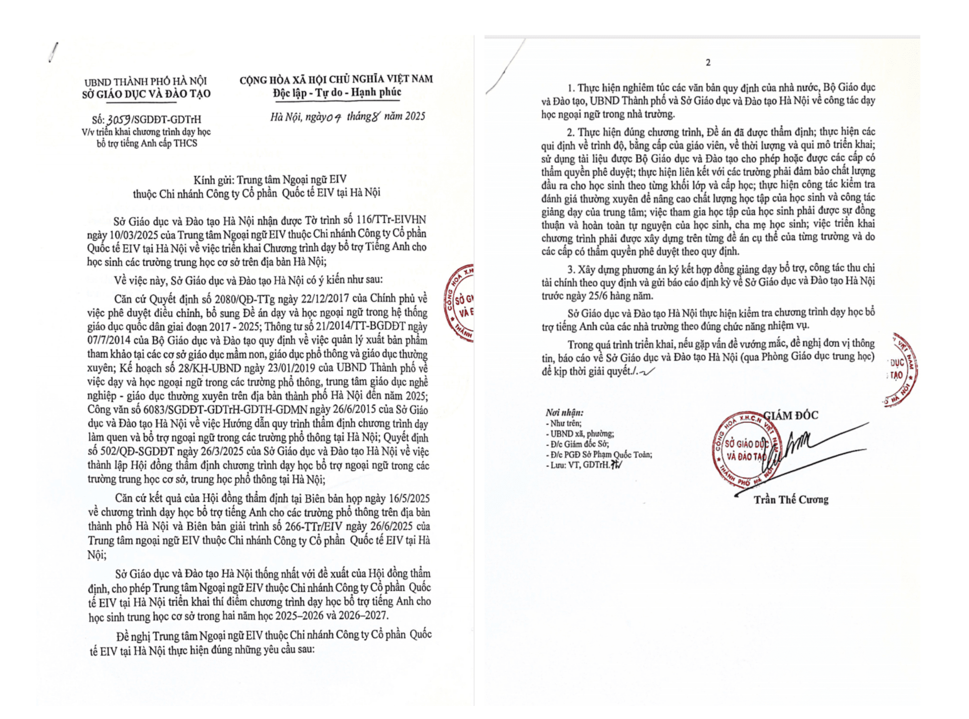 Chương trình Tiếng Anh liên kết cho học sinh trung học cơ sở tại EIV là chương trình được Sở Giáo dục và Đào tạo Hà Nội cấp phép chính thức ngày 04/08/2025, triển khai tại các trường trung học cơ sở trên địa bàn thành phố với 100% giáo viên bản ngữ có kinh nghiệm trên 2 năm và đầy đủ bằng cấp quốc tế (TESOL/CELTA/TEFL). Nội dung các chủ đề và phạm vi ngữ pháp bám sát trong bộ sách Tiếng Anh Global Success 6-7-8 (GS) được Bộ Giáo dục – Đào tạo phê duyệt.